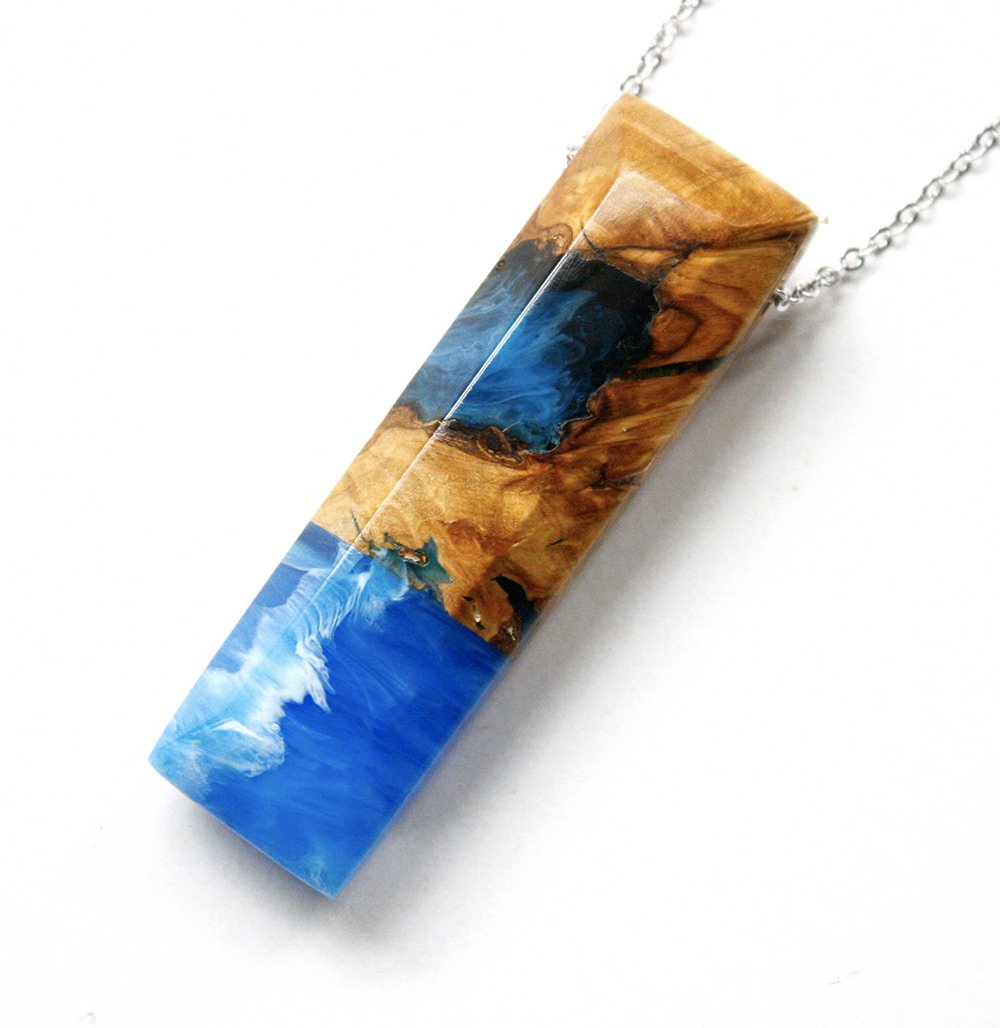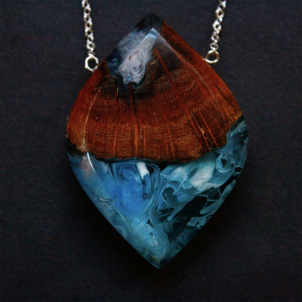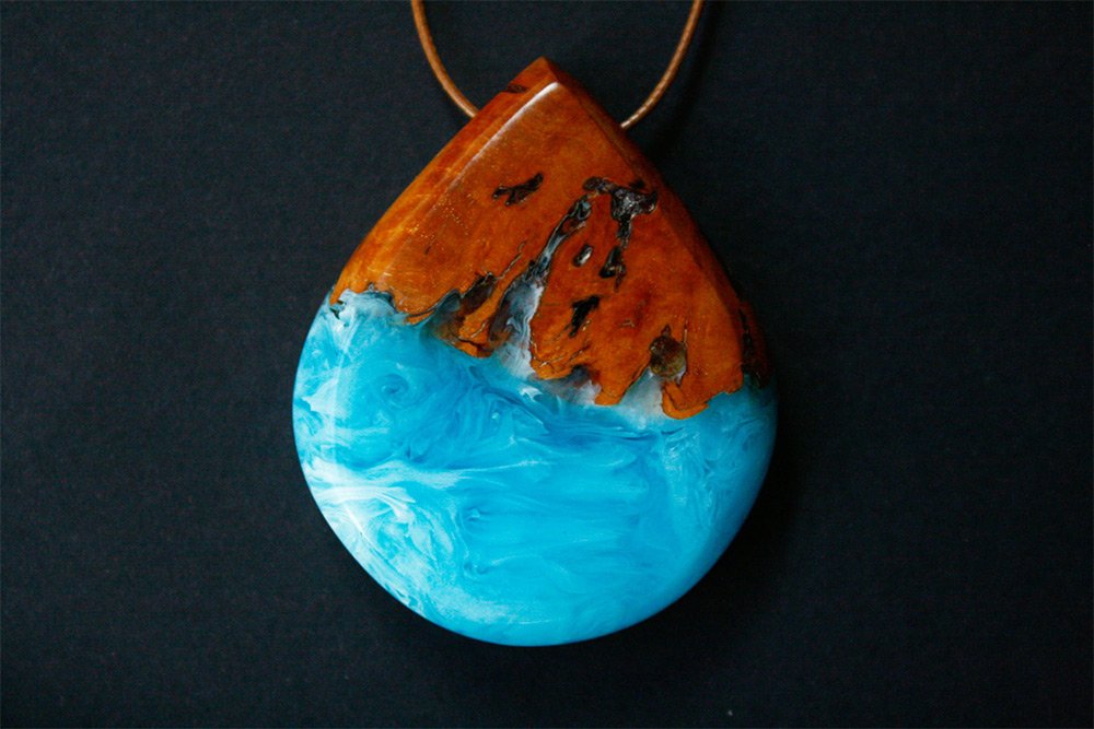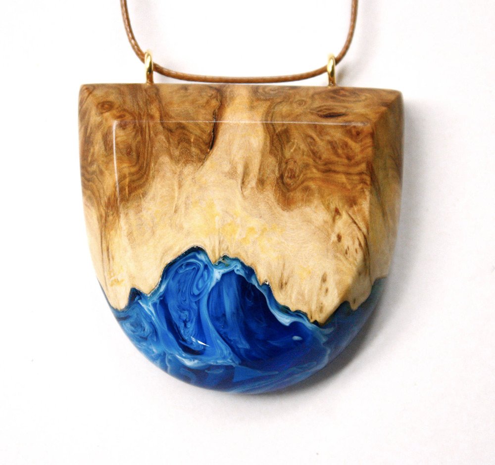 Некоторые из последних украшений ручной работы Бритты Бекманн сделаны из сочетания непрозрачной белой и полупрозрачной синей смолы с фрагментами древесины австралийского эвкалипта лососевокорого. В результате создаётся потрясающий эффект волн, разбивающихся о берег, как будто смотришь на это сверху. |