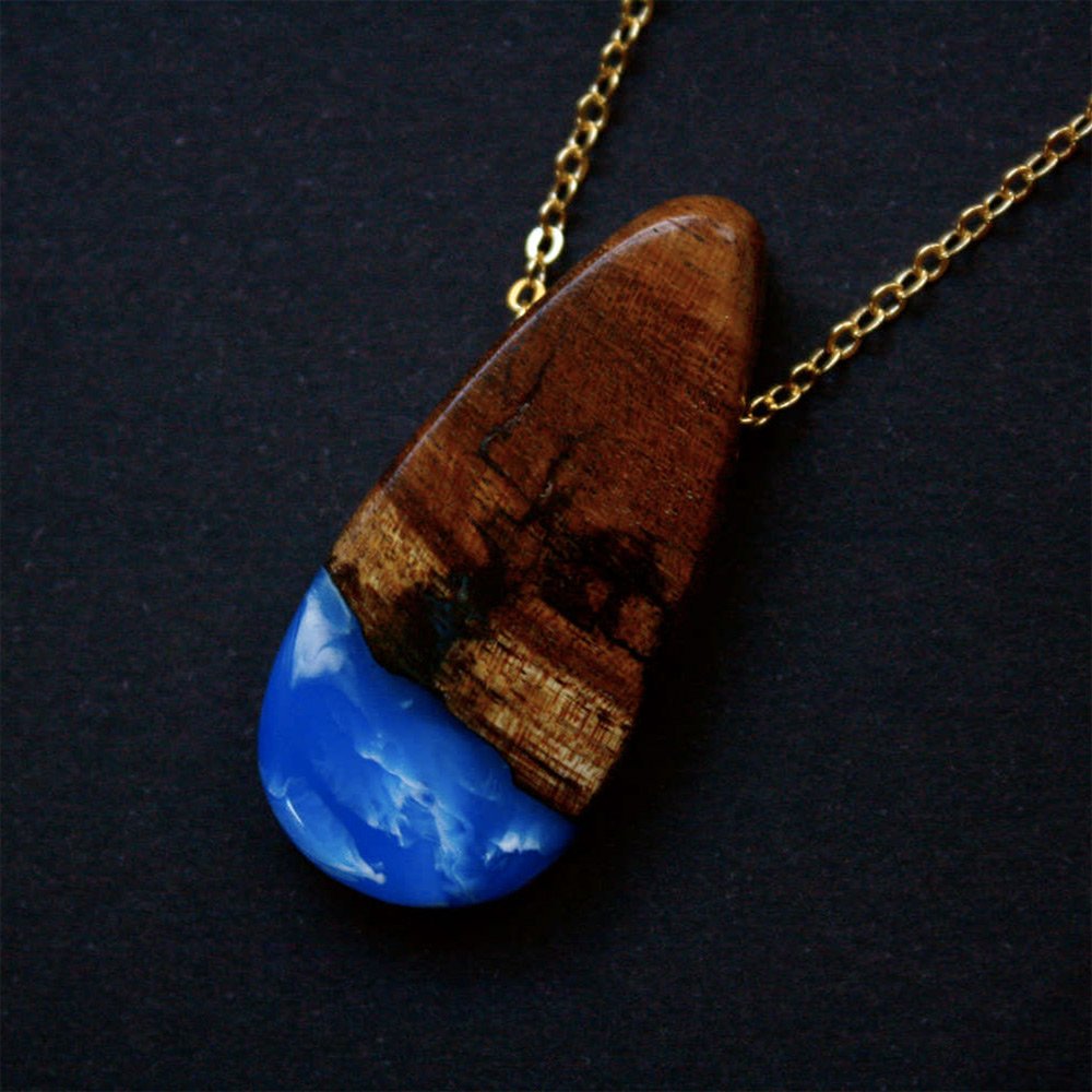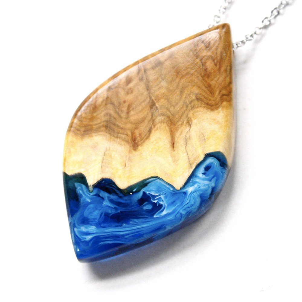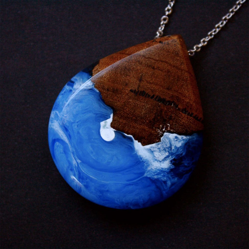 Некоторые из последних украшений ручной работы Бритты Бекманн сделаны из сочетания непрозрачной белой и полупрозрачной синей смолы с фрагментами древесины австралийского эвкалипта лососевокорого. В результате создаётся потрясающий эффект волн, разбивающихся о берег, как будто смотришь на это сверху. |